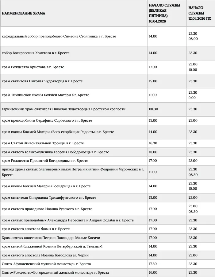 Расписание богослужений в храмах и монастырях г. Бреста: Великая пятница, Пасха Христова.